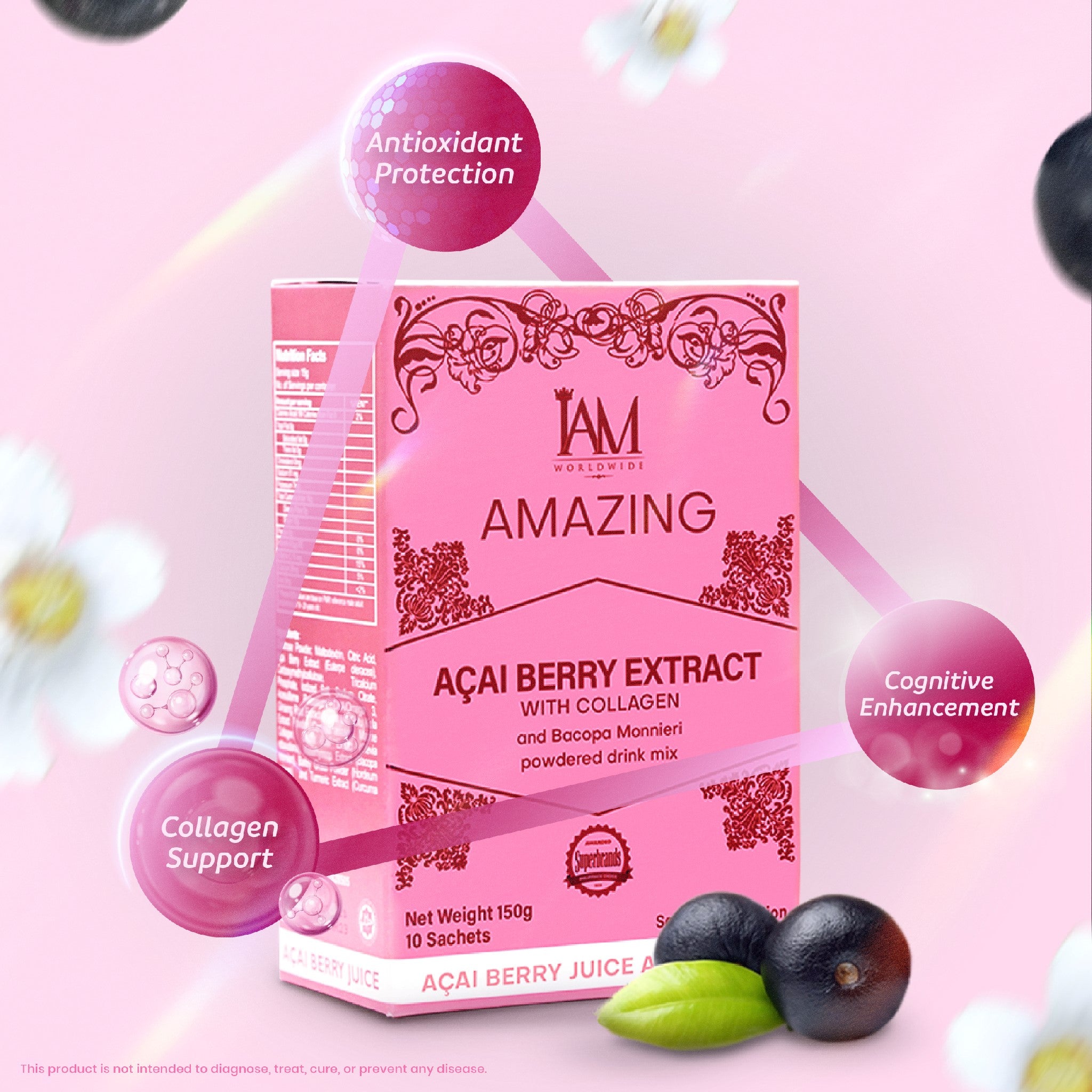 Get here 👉IAM Acai Berry is a premium powdered drink mix from IAM Worldwide formulated with Acai Berry Extract, Collagen, and Bacopa Monnieri. This antioxidant-rich supplement is designed to support skin glow, cognitive function, and overall wellness.